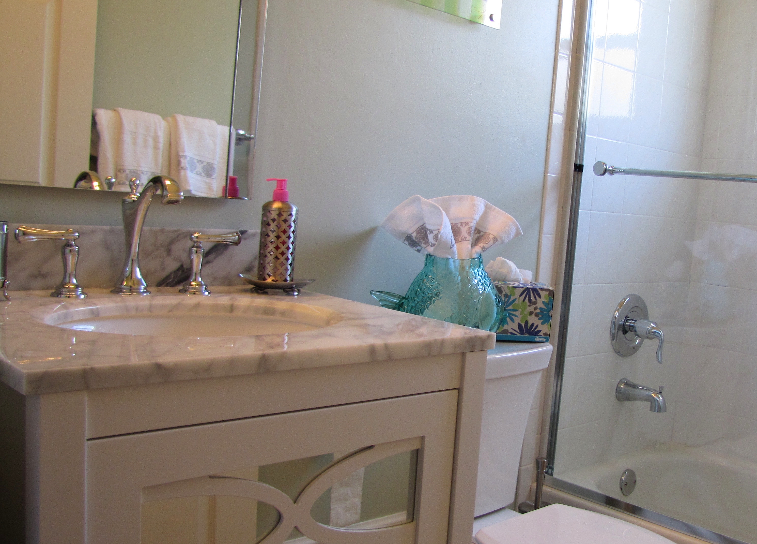 The bathroom is marvelous. The free standing cabinet with its custom made granite