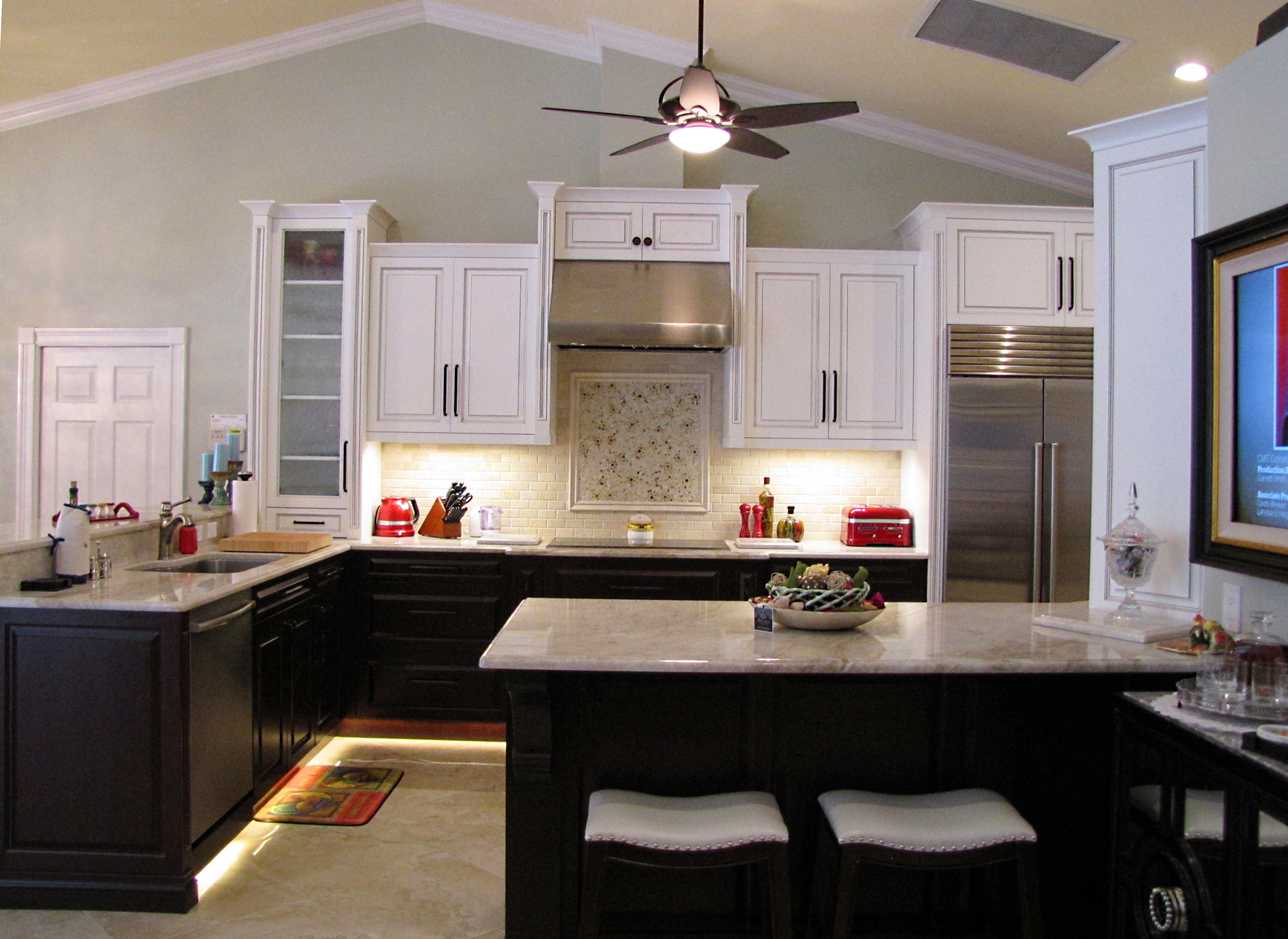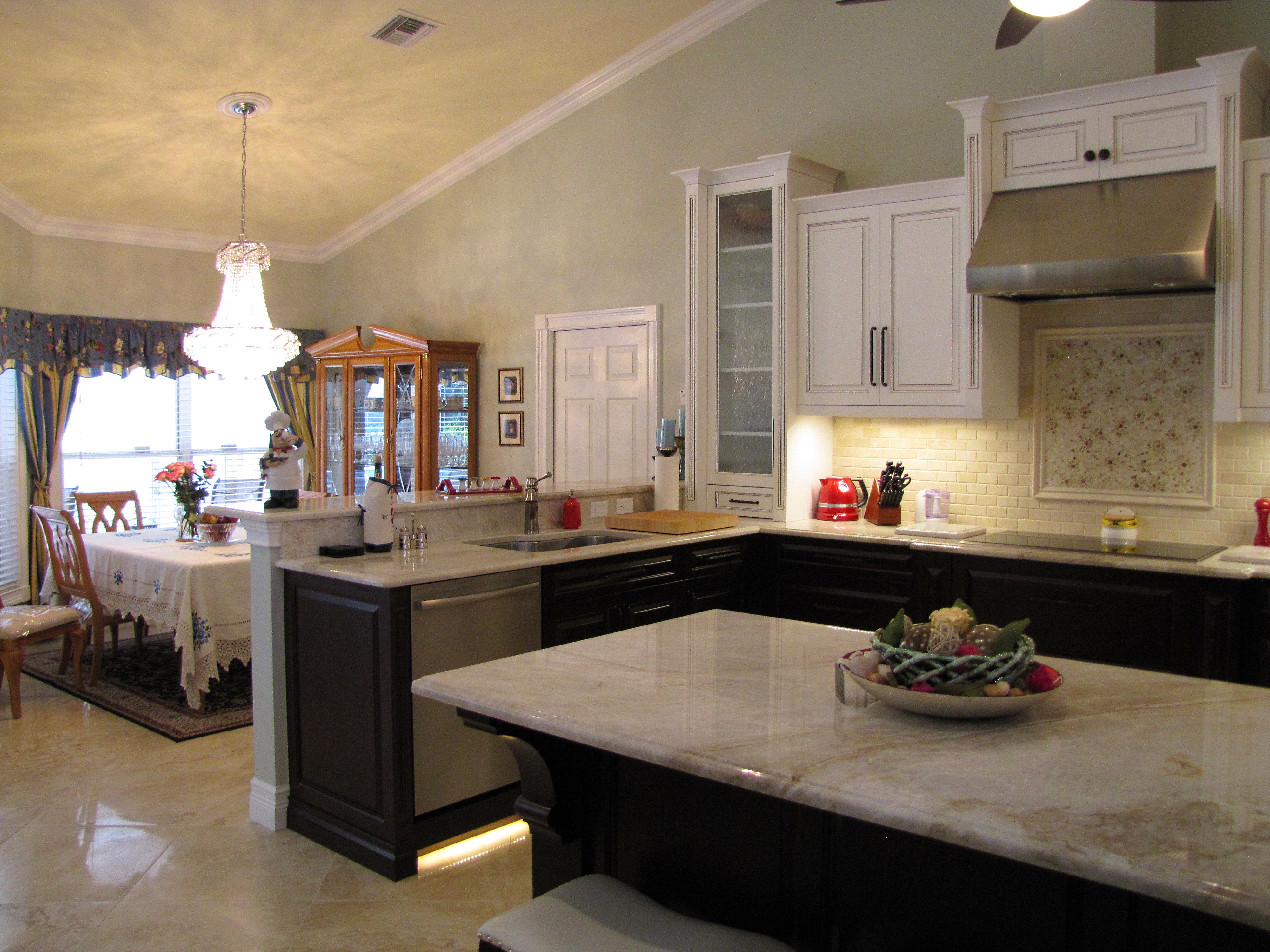 The kitchen is quite large and has a lot of cabinetry all of it full of top of the line plates, silverware, cups, glasses, cooking pots and utensils. It overlooks the dining area to where food can be conveniently passed via the breakfast bar. The counter tops are exotic granite "Taj Mahal", and the two tone cabinetry was custom made just for us. It also overlooks into the huge living room.